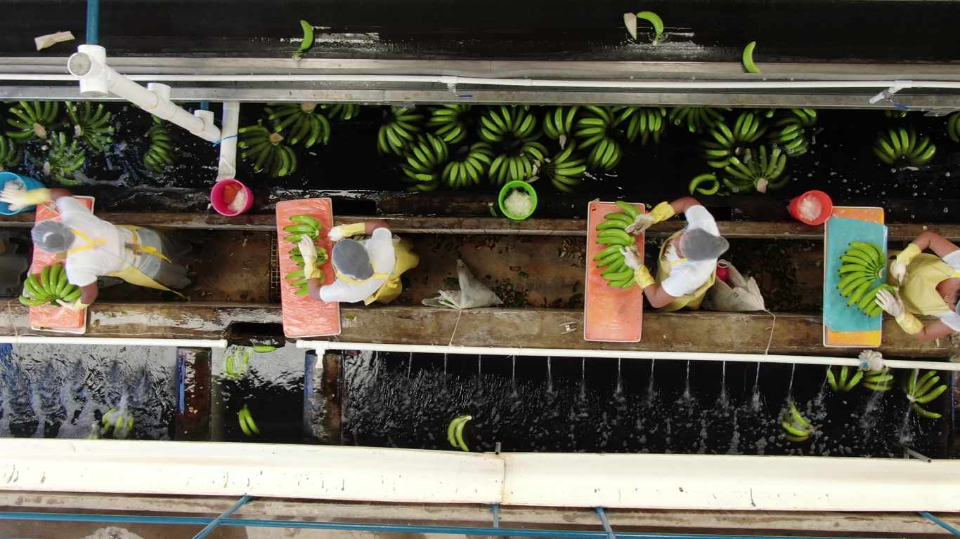 En la planta empacadora, el agua se emplea en los tanques de lavado que tienen dos principales funciones: reducir la temperatura del racimo y retirar el exceso de látex por los cortes al racimo y gajos.  El agua usada en estos tanques está en continuo monitoreo ya que los parámetros de calidad microbiológica son sumamente estrictos.